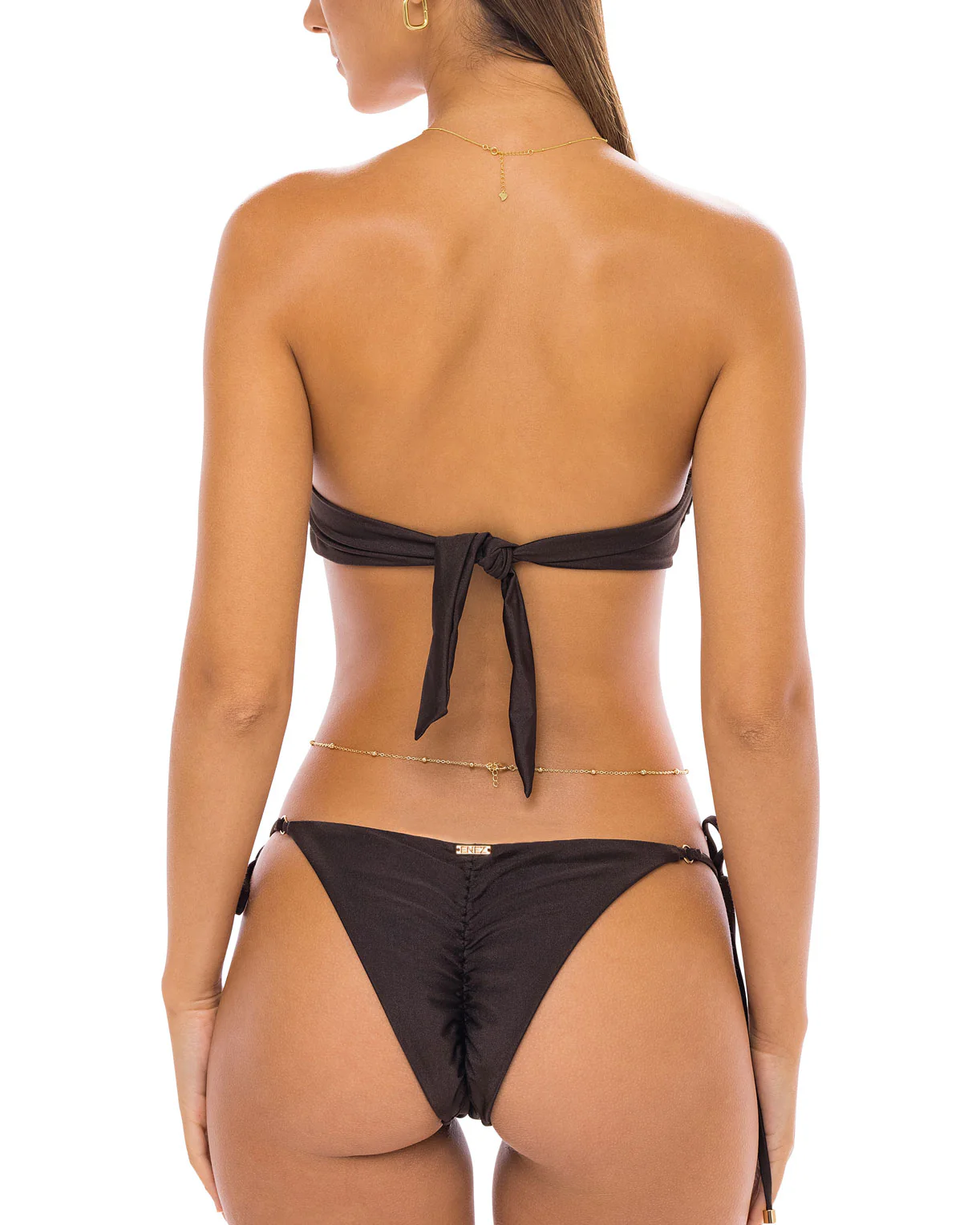 The Frida top is a beautiful bandeau top with shelled detail in the front. A textured gold ring in the middle and tie at the back allow for a supportive and custom fit and minimal tan lines. This triple layered top is made from super-soft semi-shine fabric and comes with removable padding and a silicon non-slip grip inside.Ā